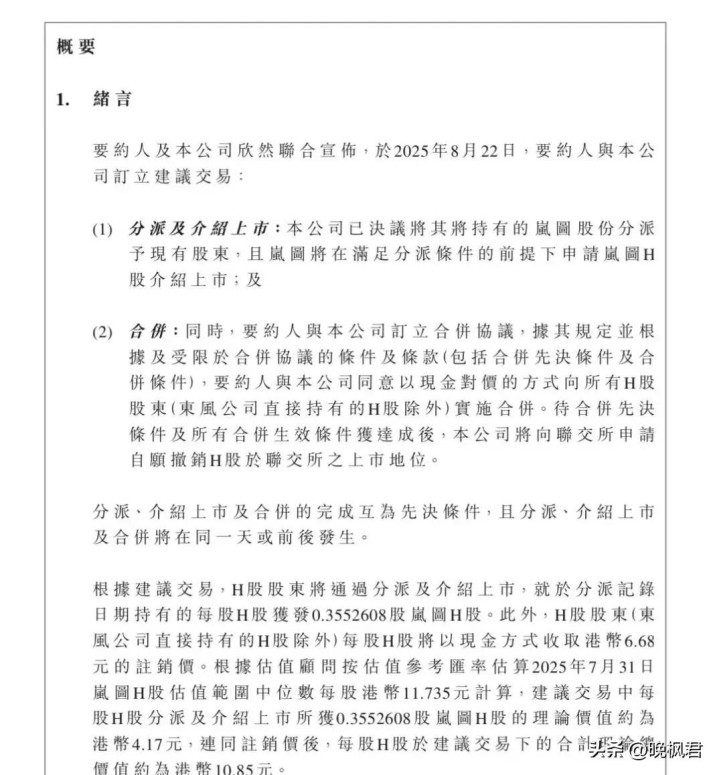 8月23日凌晨,港交所突然传来消息,东风集团宣布完成私有化退市,旗下岚图品牌同期以介绍方式登陆港股。这距离某汽车媒体8月14日预测"岚图分拆上市"仅过去十天,当时分析文章阅读量就突破四万七千次。说白了就是东风这家老车企把自家新能源品牌岚图推上前台,自己却从股市里退下来了。